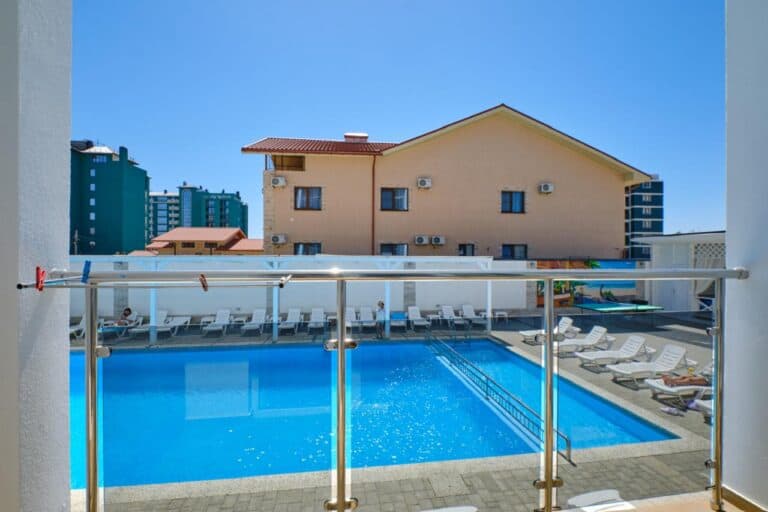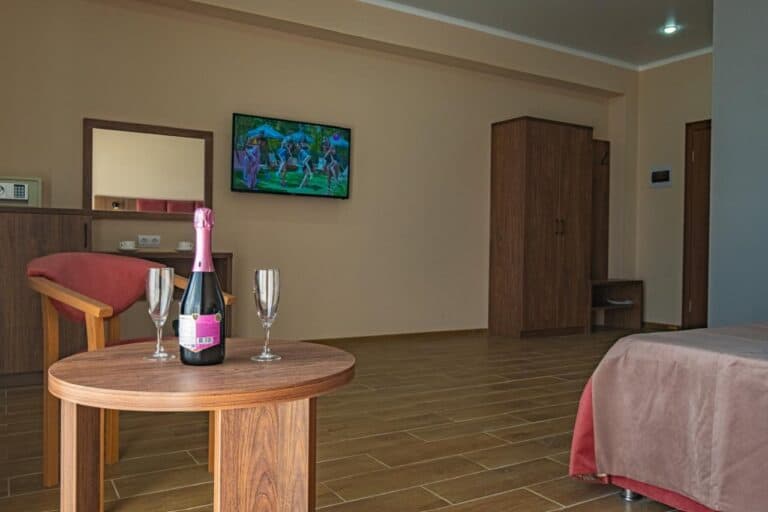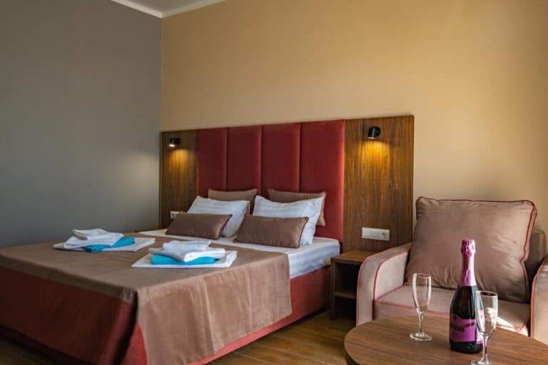 Вы будете приятно удивлены элегантностью и простором номера категории "Улучшенный". В вашем распоряжении шикарная двуспальная кровать, мягкая диванная зона с пуфами и универсальным столом, телевизор, туалетный столик с большим зеркалом и креслом, балкон со столиком с видом на внутренний двор с бассейном и многое другое для исключительно комфортного отдыха.