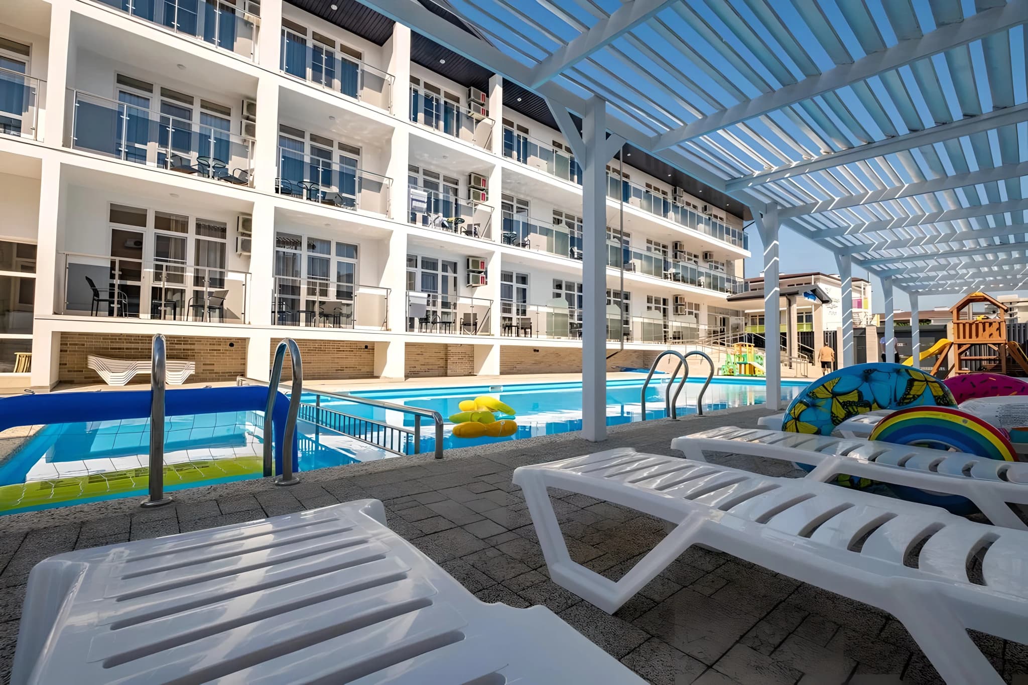 Территориально мы расположены в Витязево, в шаговой доступности море, парк развлечений, рестораны, клубы, аквапарк. В то же время, территория расположена так, что вас не будут мешать шум оживленных улиц и заведений. Витязево — пригород Анапы, куда без труда можно добраться разными способами. В то же время наш пляж выгодно отличается от пляжей Анапской бухты.