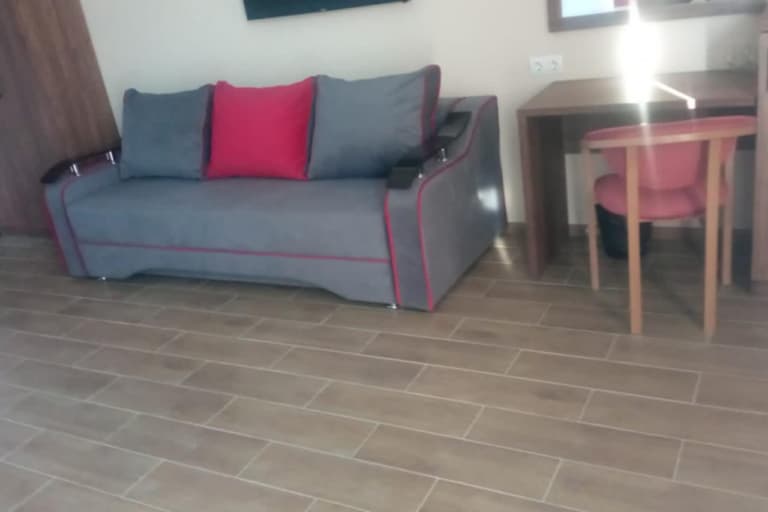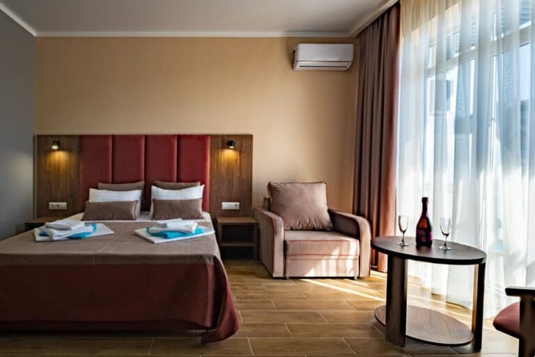 Вы будете приятно удивлены элегантностью и простором номера категории "Улучшенный". В вашем распоряжении шикарная двуспальная кровать, мягкая диванная зона с пуфами и универсальным столом, телевизор, туалетный столик с большим зеркалом и креслом, балкон со столиком с видом на внутренний двор с бассейном и многое другое для исключительно комфортного отдыха.